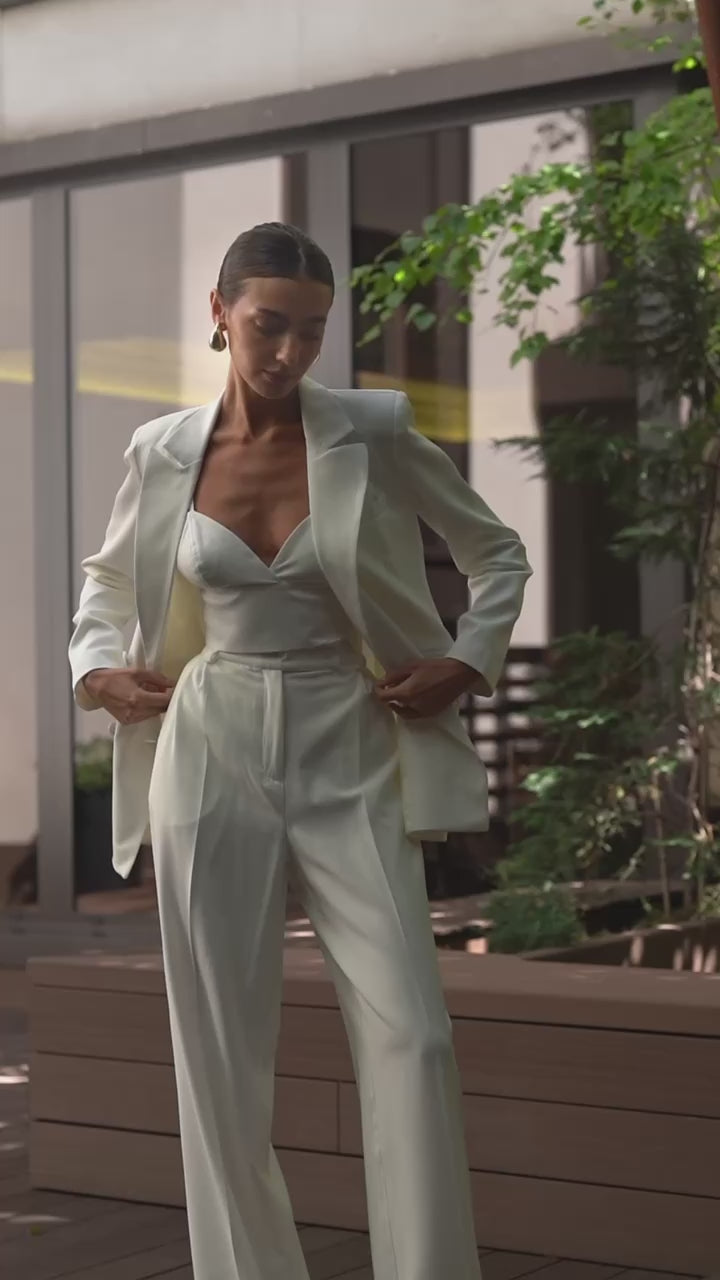 White Three Piece Suit|Double Breasted Blazer with Wide Leg Pants + Top